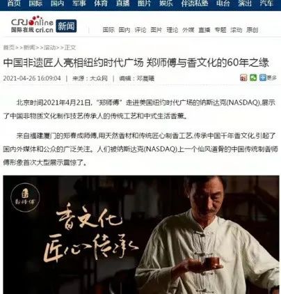 今年4月,“郑师傅”家的制香手艺终于在纽约时代广场中亮相,震撼海内外,赞誉无数。