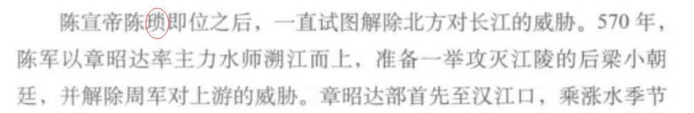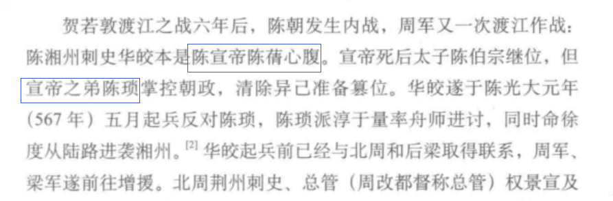 “华皎”“陈蒨”两个人名,单就文字拼写而言是正确的。但陈蒨与陈宣帝并不匹配。如前文,陈宣帝名陈顼,而陈蒨的谥号是文帝,这就需要编辑去核实作者想表述的到底是陈文帝陈蒨,还是陈宣帝陈顼。根据史料,华皎是陈蒨的心腹。所谓的“宣帝死后”“宣帝之弟陈琐”,其实都是将“文帝”误作“宣帝”了。前一页提“陈宣帝陈蒨”“宣帝之弟陈琐”,后一页提“陈宣帝陈琐”,这实在让陈宣帝为难,到底他叫什么名字?