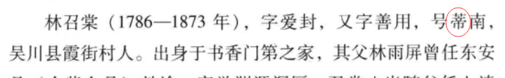 道光年间粤西地区的状元林召棠,号芾南,有书误作“蒂南”。出错的原因,除了“芾”与“蒂”形近,还与作者和编辑没弄清楚此号的典故有关。