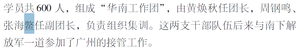 广州临解放时担任“华南工作团”副团长的张海鳌,在书稿中,“鳌”字被写成“鳖”。鳌是传说中能驮三座山的神龟。与其相关的词语多与独特的想象相关联,如“独占鳌头”“钓鳌客”。鳖嘛,则近乎骂人了。如果张海鳌的后人看到先人的名字被写成这个样子,肯定是很不舒服的,因此产生纠纷也说不定。