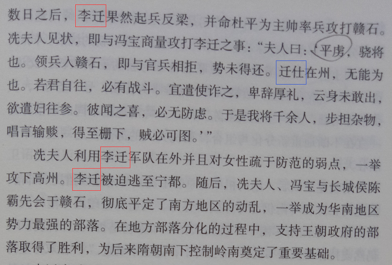 人名中的字被“吃”掉,也是编校中较常发现的错误。如某图书在介绍冼夫人联合陈霸先平定高州刺史李迁仕之乱时,多处将李迁仕写作“李迁”。如下图所示,引文中有“迁仕在州,无能为也”,细心的编辑不用查阅史书,也能意识到多次出现的“李迁”与“迁仕”存在矛盾。