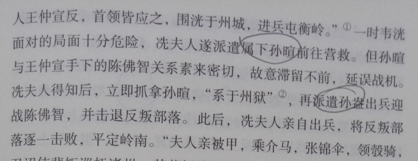 某图书在介绍隋朝初年冼夫人平定王仲宣之乱时,提到冼夫人的两名下属“孙暄”与“孙盎”。