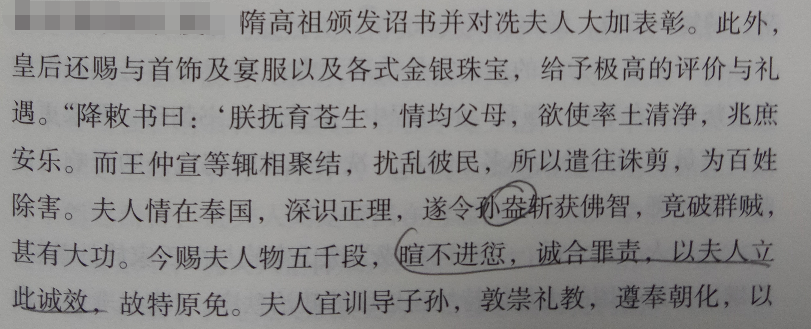 同页尾有一段隋文帝嘉奖冼夫人的文字,中有“遂令孙盎斩获佛智”,“暄不进愆,诚合罪责,以夫人立此诚效,故特原免。夫人宜训导子孙……”。读到这,笔者隐隐然觉得不对劲:下属获罪,为什么要夫人训导子孙?古文常有省略姓氏的习惯,莫非这里的“孙盎”是指“(冼夫人之)孙(冯)盎”?查阅史料,果不其然,所谓的“孙盎”“孙暄”并不是冼夫人手下两名孙姓将领,而是冼夫人的嫡孙冯盎、冯暄。作者解读有误,以致创造出两个本来并不存在的姓名。