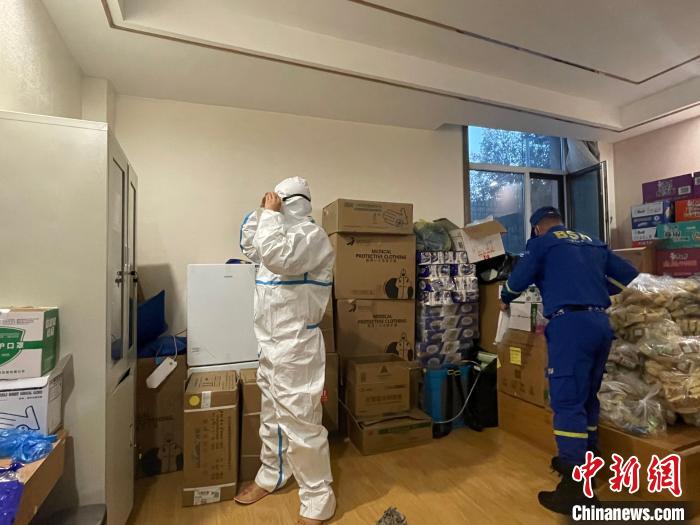 图为蓝天救援队队员党世录(左)利用自己的休假时间参加抗疫工作。祁绣娟 摄