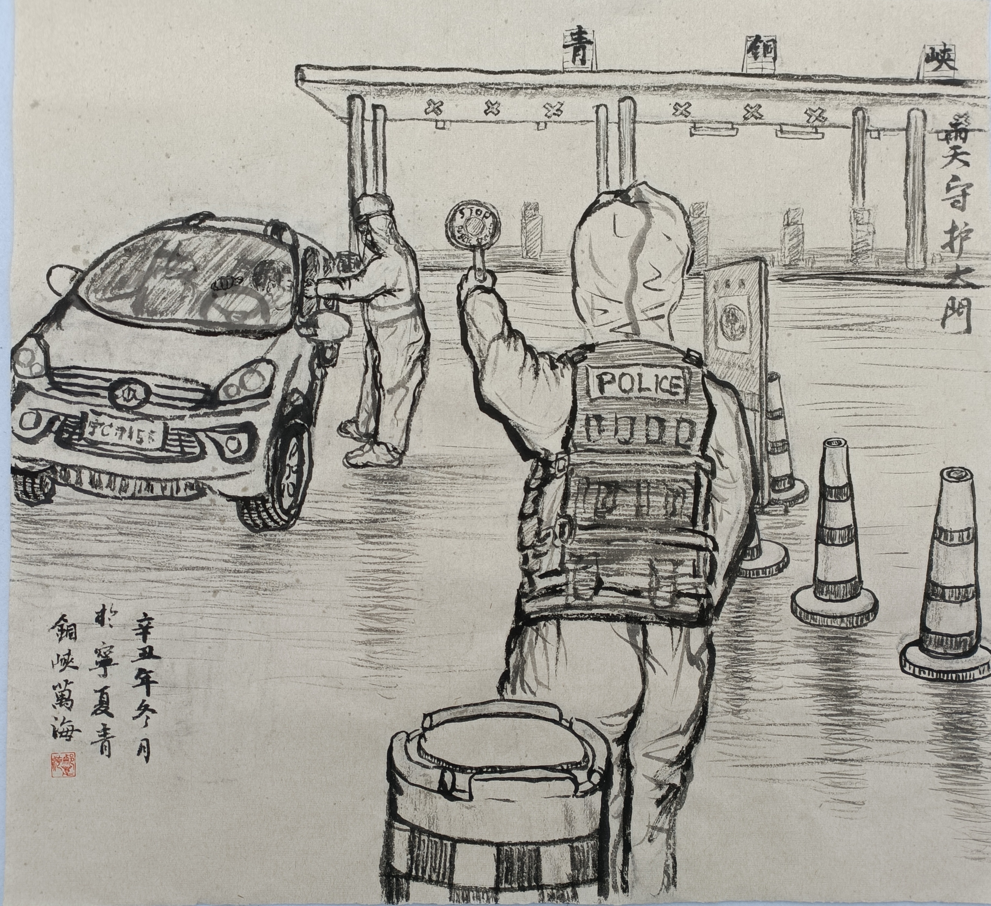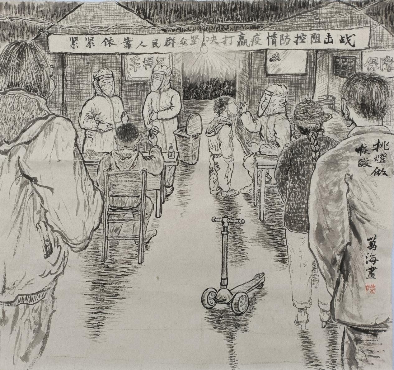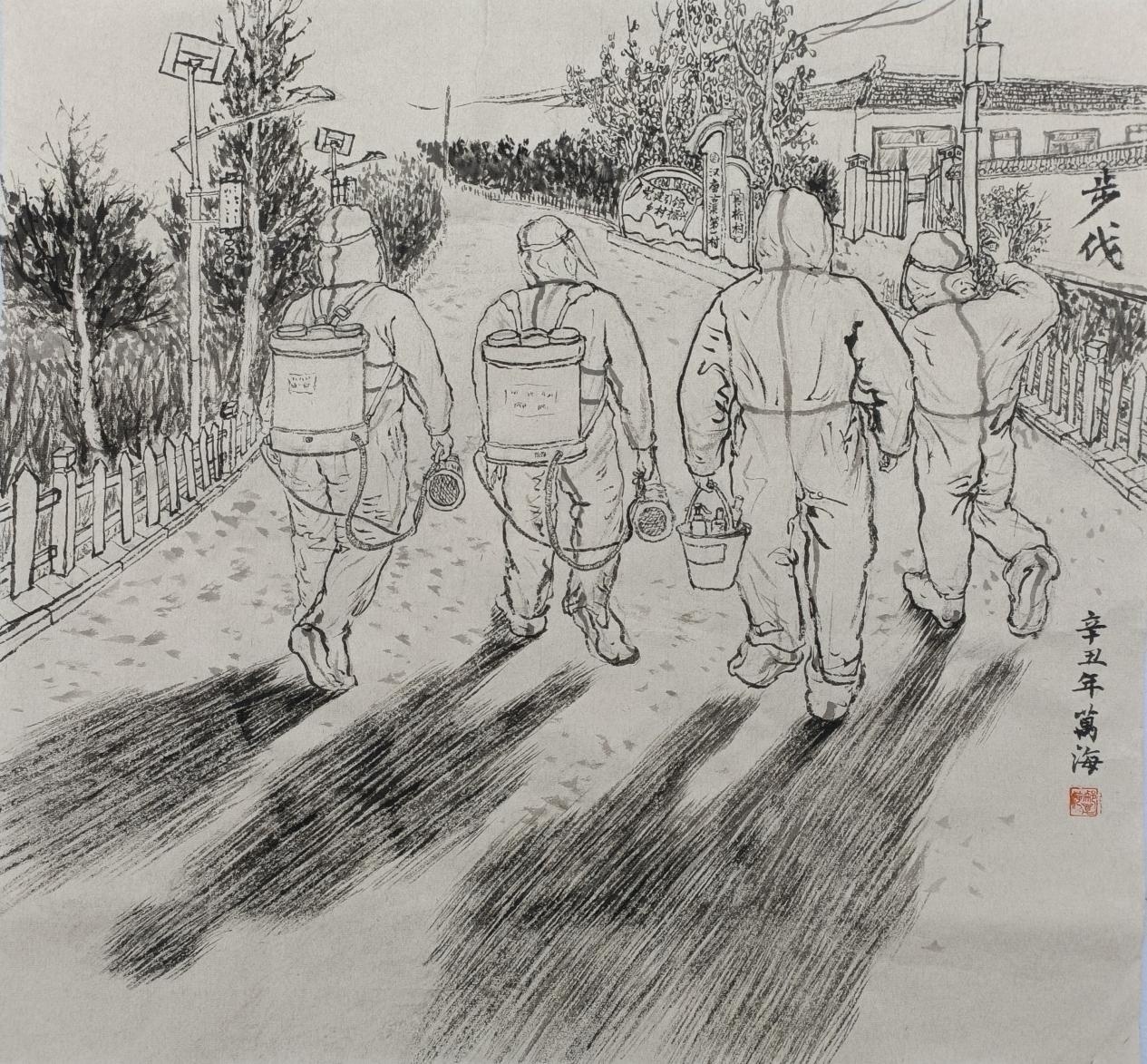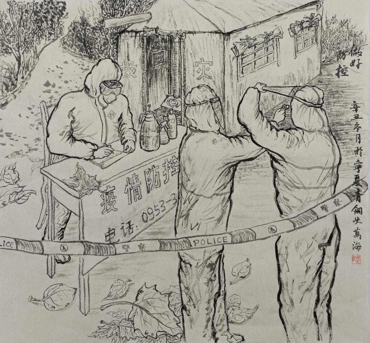 宁夏青铜峡市美协主席蒯万海为了致敬逆行者,用画记录他们的工作状态。