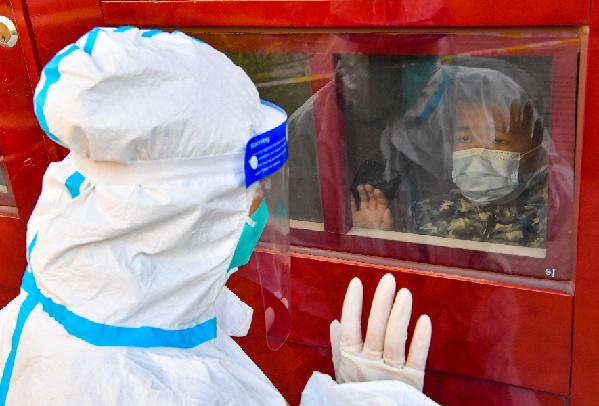 妈妈坚守在防疫一线,儿子封控在家,隔着单元门,母子俩用眼神诉说思念。詹思佳摄