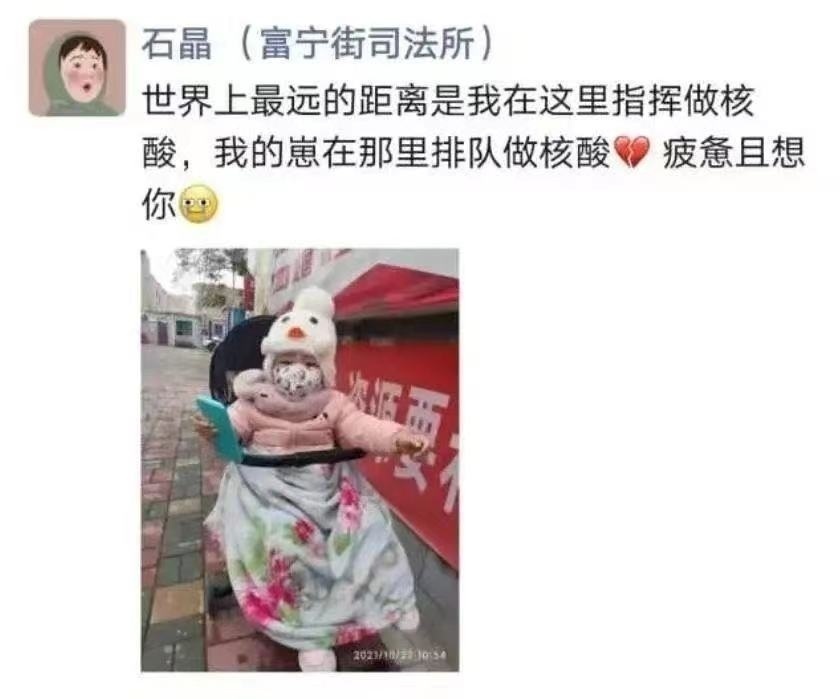 “世界上最远的距离是我在这里指挥做核酸,我的崽在那里排队做核酸。”这是银川市兴庆区司法局富宁街司法所所长石晶的战疫日记。