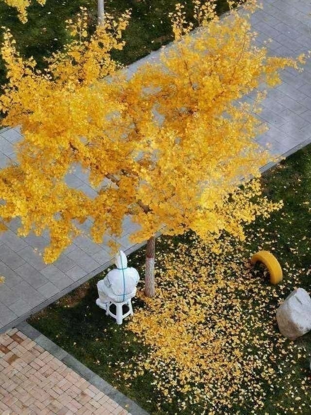 银川市一居民用手机记录一名进行核酸检测的医护人员,坐在树下进行短暂的休息:金黄的银杏树下,她静静坐着……