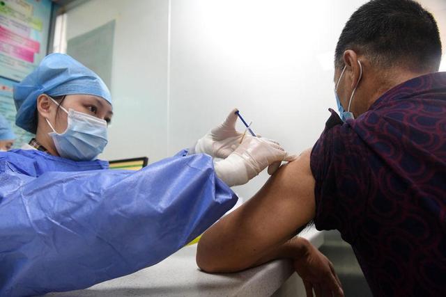 11月2日,在南宁市青秀区方园社区卫生服务中心,医务人员给居民接种新冠疫苗加强针。