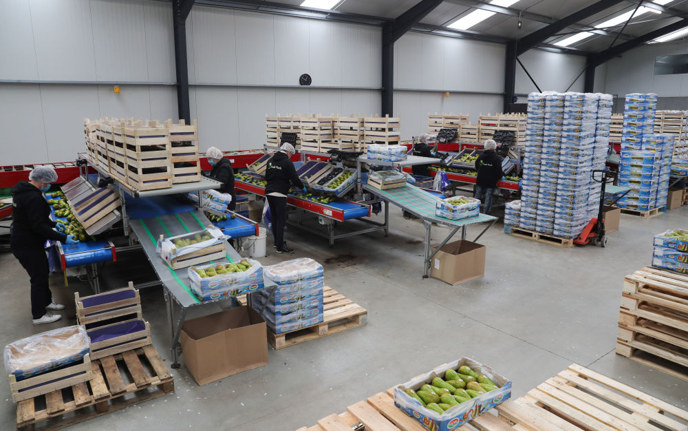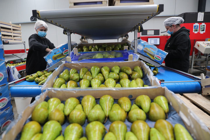 10月22日,工作人员在比利时圣希利斯-瓦斯市的一个水果分拣包装车间将即将出口的比利时啤梨装箱。新华社记者 郑焕松 摄