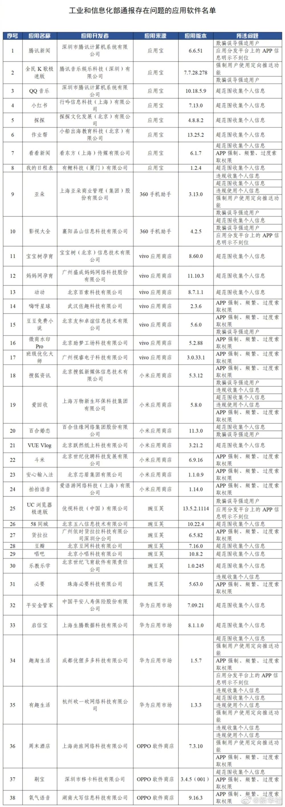 【工信部通报38款违规App 涉超范围索取权限、过度收集用户个人信息等】工信部3日在官网发布通报,近期针对用户反映强烈的App超范围、高频次索取权限,欺骗误导用户下载等违规行为进行了检查,共发现38款App存在问题。工信部要求这些App应在11月9日前完成整改,逾期不整改或整改不到位的,将依法依规进行处置并予以行政处罚。