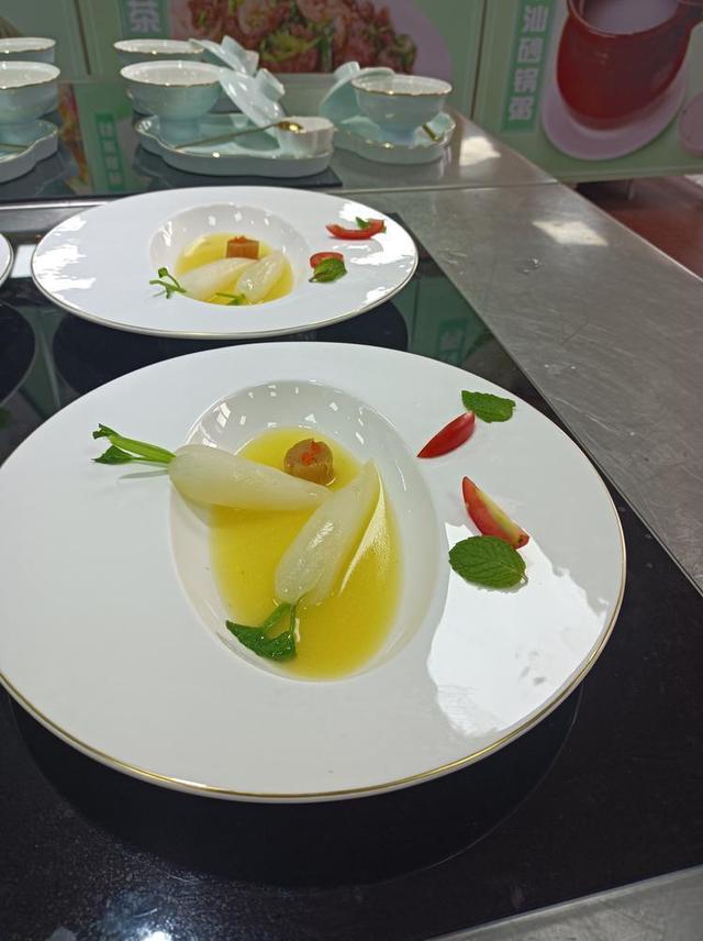 “秋冬时节的白萝卜是最好的,这道菜我选用这种简单的当季食材,加上元贝和上汤去焗,体现了潮菜制作中时节吃时菜的特点。”据沈沛生介绍,不仅如此,造型也是该道菜的一大亮点,将大萝卜切成10厘米左右的小萝卜造型,一口吃下一个,潮菜的“食精”“食巧”也在其中得到彰显。