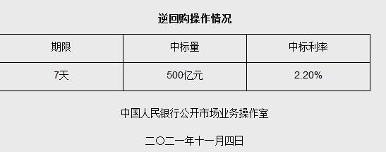 央视网消息:据央行网站消息,为维护银行体系流动性合理充裕,2021年11月4日人民银行以利率招标方式开展了500亿元逆回购操作。具体情况如下: