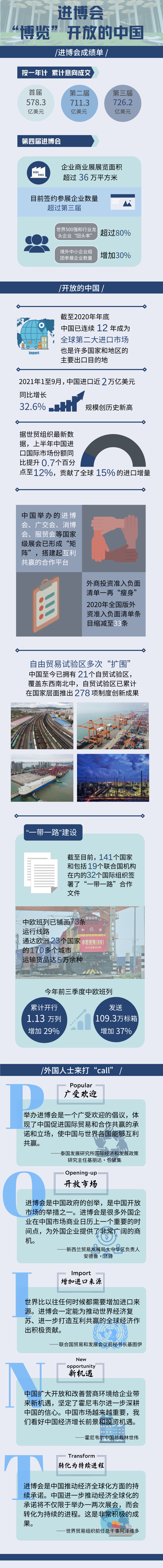 进博会的丰硕成果,是中国进一步对外开放的最好证明。近年来,中国持续推动高水平对外开放,不断向世界敞开市场。一场场世界级的国际展会,一项项重大深改举措和外资优惠政策出台,赢得广泛赞誉。外国人士认为,中国扩大开放、改善营商环境为企业带来新机遇,为疫情下世界经济复苏作出了实实在在的贡献。