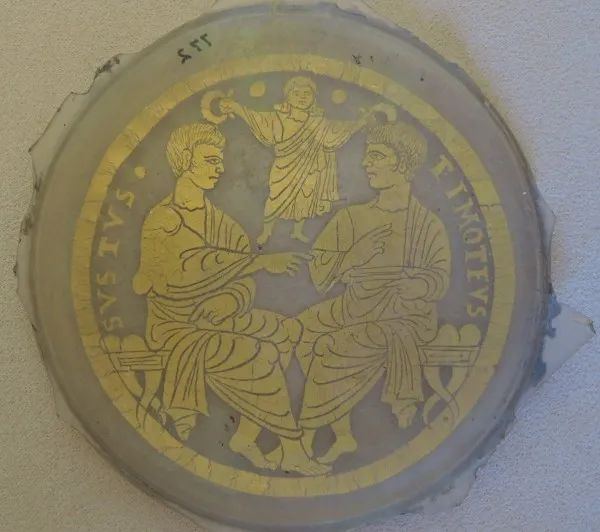 ▲ 古罗马夹金玻璃《圣徒西克斯图斯和提摩太,被耶稣加冕桂冠》(约公元三、四世纪)
