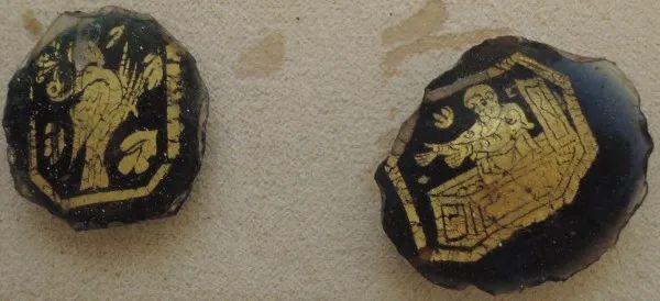 ▲ 古罗马夹金玻璃《挪亚从方舟中放出鸽子》、《放飞自我的鸽子》(约公元三、四世纪)