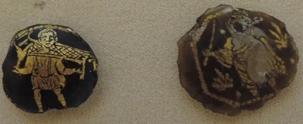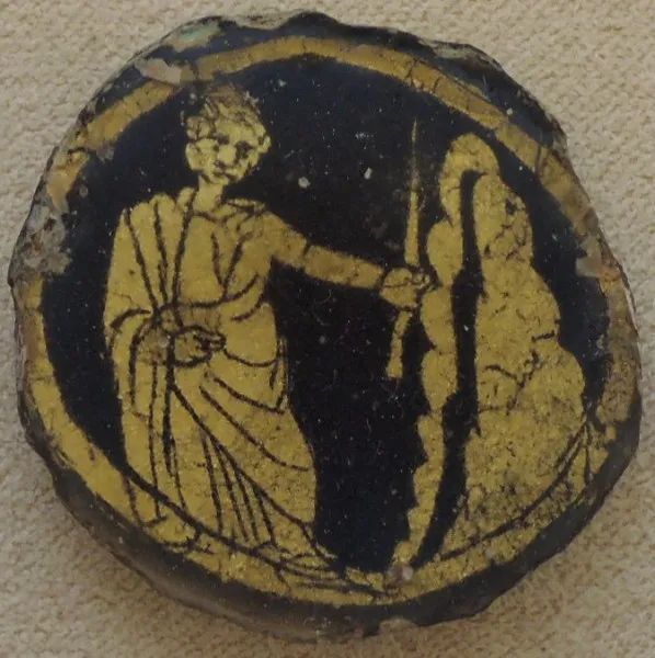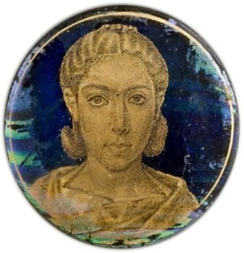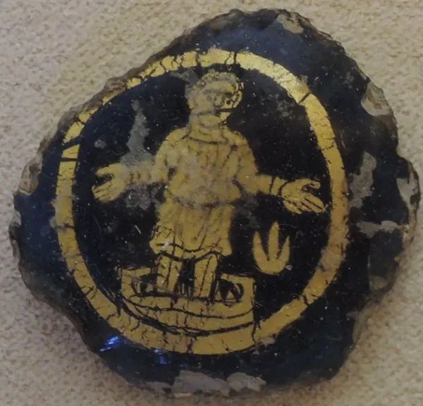 ▲ 古罗马夹金玻璃女子像徽章(约公元三世纪)