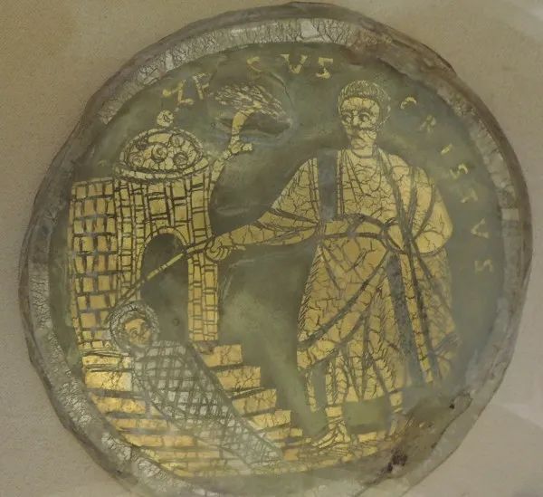 ▲ 古罗马夹金玻璃《耶稣医治瘫痪病人》(约公元三、四世纪)