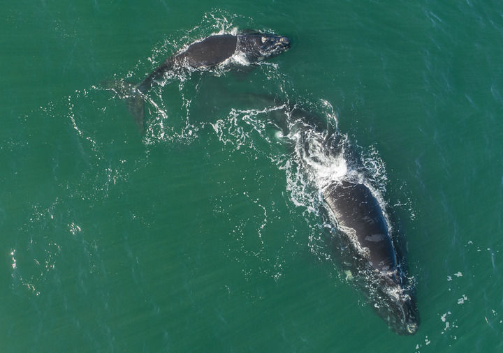 9月28日,在南非西开普省赫曼努斯海域,一头成年南露脊鲸母亲带着幼崽在海面玩耍(无人机拍摄)。(新华社记者陈诚摄)