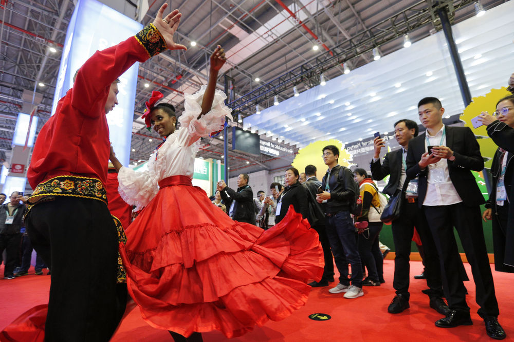 2018年11月8日,在首届进博会上,一名多米尼加舞者(红裙者)和一名俄罗斯舞者在展馆内起舞。(新华社记者张玉薇摄)