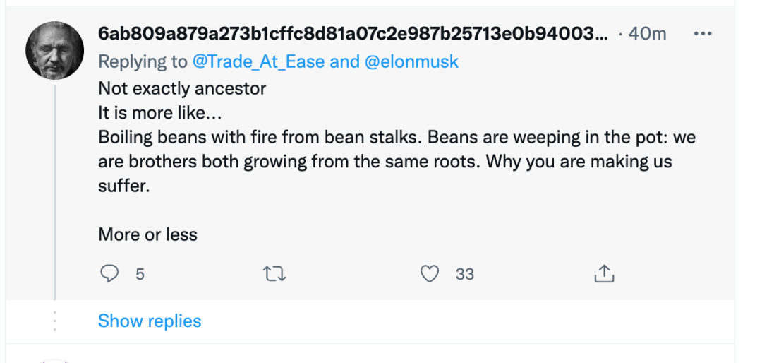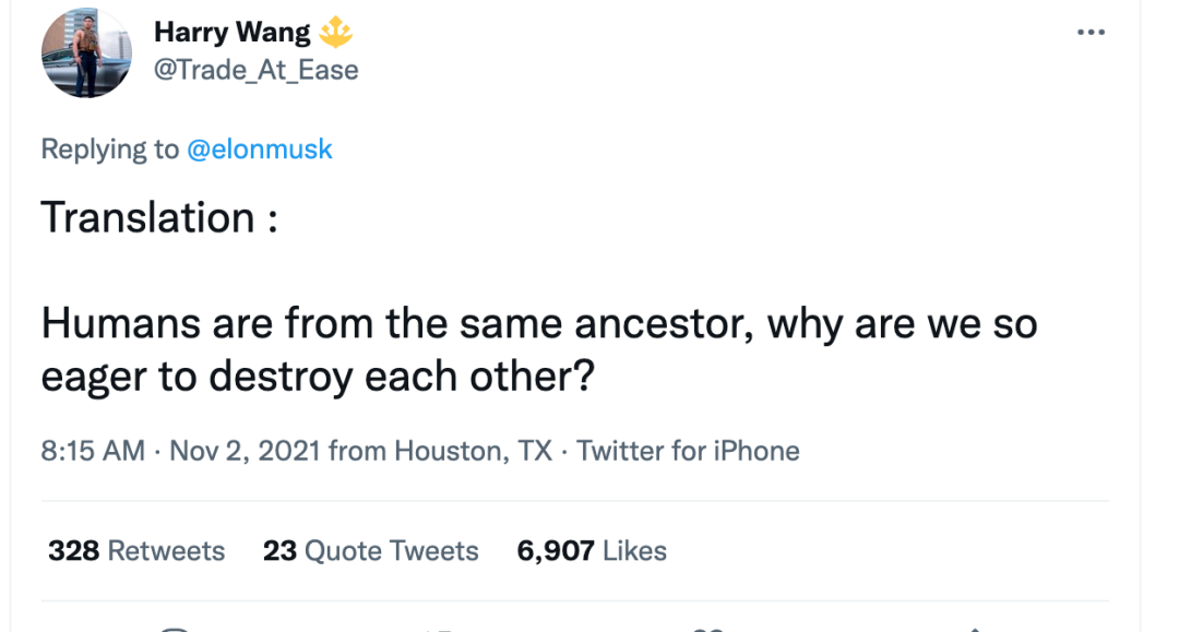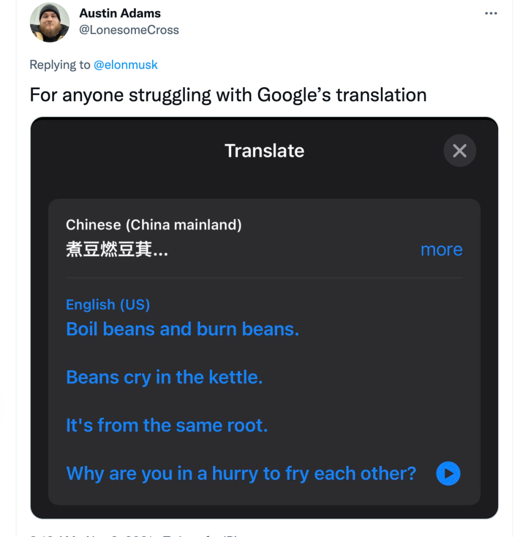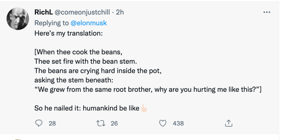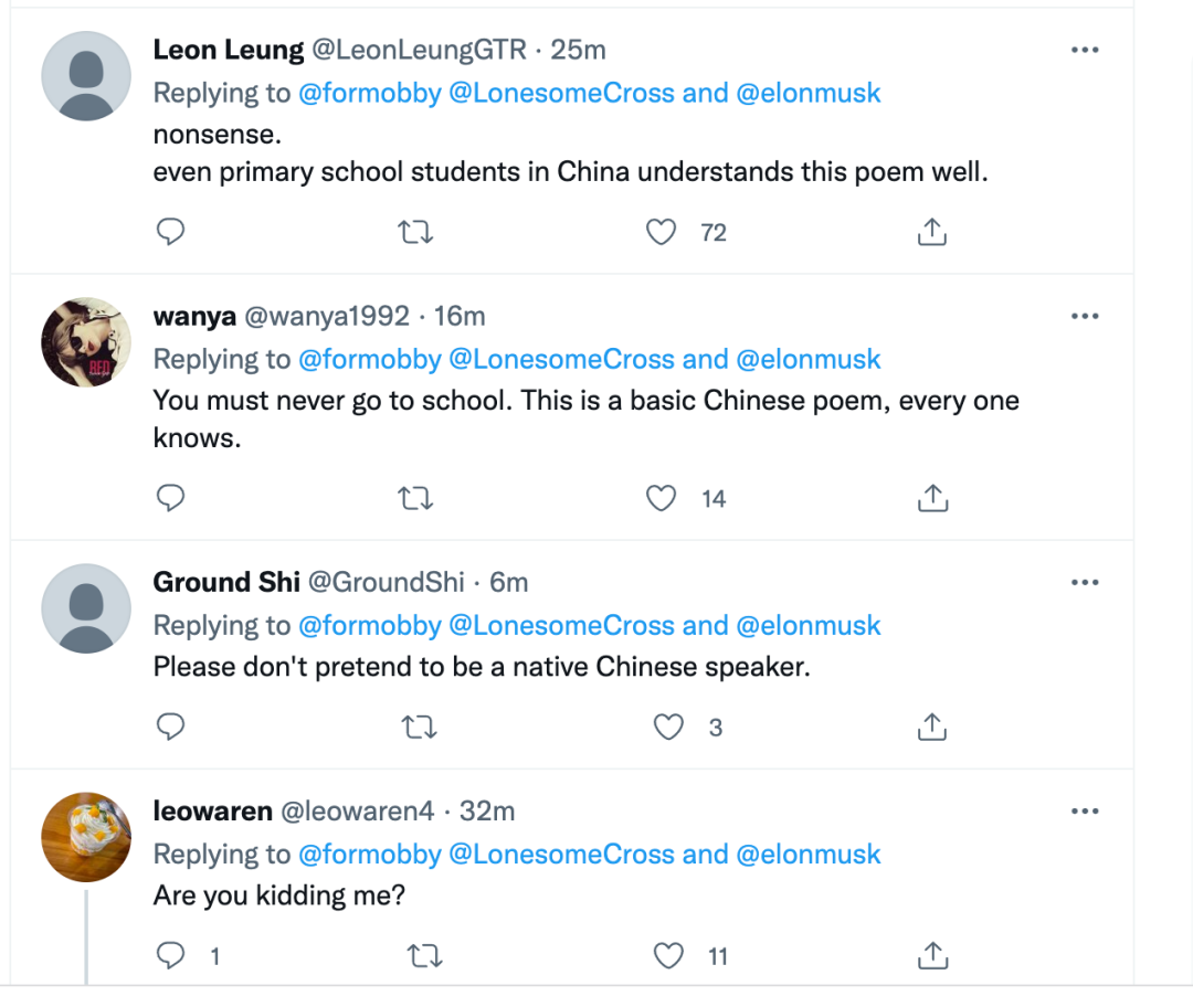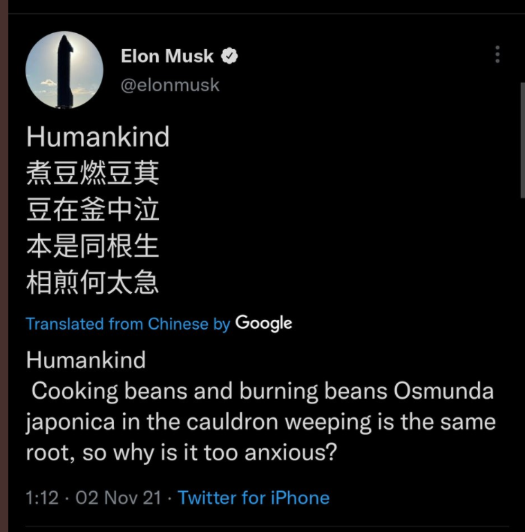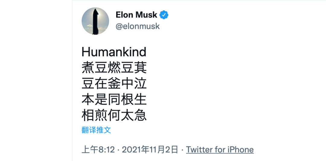 我更好奇的则是,这样一首距今至少已经1500年的中国古诗,在被马斯克原封不动用中文发出来以后,该怎么用英文把这首诗翻译给不懂中文的人看。