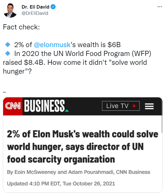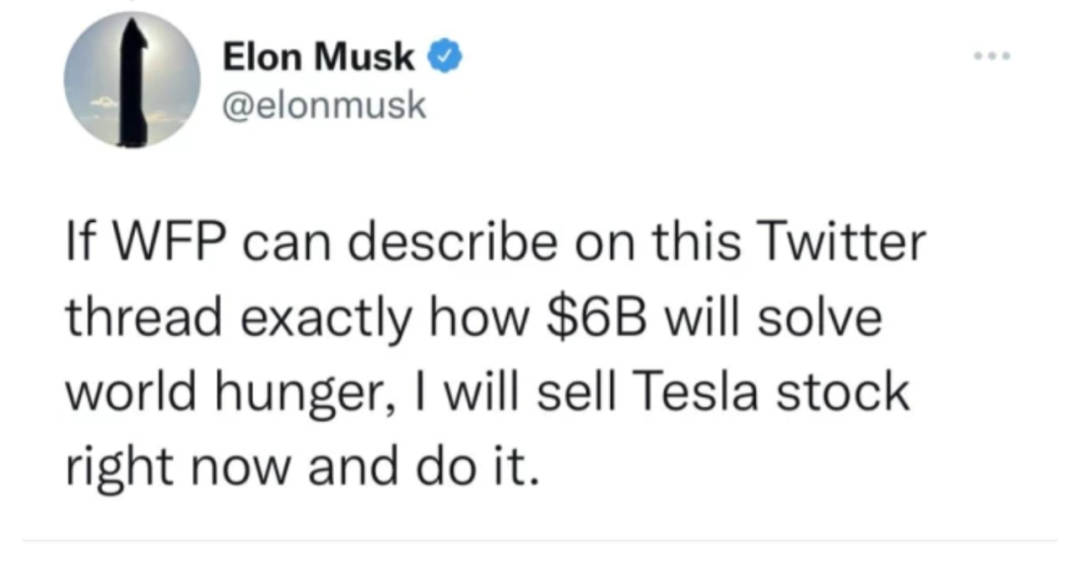如果WFP能讲清楚这60亿美元具体怎么能解决世界饥饿问题,我现在就卖掉特斯拉的一些股票然后去做这事。