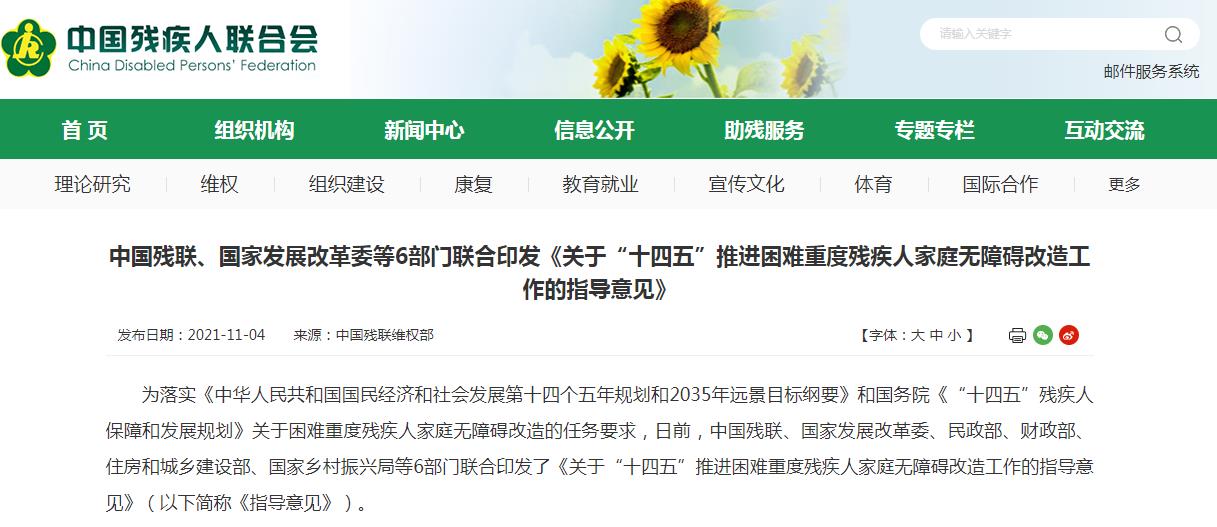 据中国残联官网消息,为落实《中华人民共和国国民经济和社会发展第十四个五年规划和2035年远景目标纲要》和国务院《“十四五”残疾人保障和发展规划》关于困难重度残疾人家庭无障碍改造的任务要求,日前,中国残联、国家发展改革委、民政部、财政部、住房和城乡建设部、国家乡村振兴局等6部门联合印发了《关于“十四五”推进困难重度残疾人家庭无障碍改造工作的指导意见》(以下简称《指导意见》)。