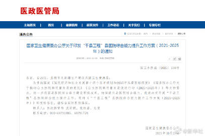 【国家卫健委:#力争到2025年全国至少1000家县医院达到三级医院水平#】国家卫健委近日印发《“千县工程”县医院综合能力提升工作方案(2021-2025年)》。方案提出,#推动省市优质医疗资源向县域下沉#,结合县医院提标扩能工程,补齐县医院医疗服务和管理能力短板,逐步实现县域内医疗资源整合共享,到2025年,全国至少1000家县医院达到三级医院医疗服务能力水平,发挥县域医疗中心作用,为实现一般病在市县解决打下坚实基础。(徐鹏航)
