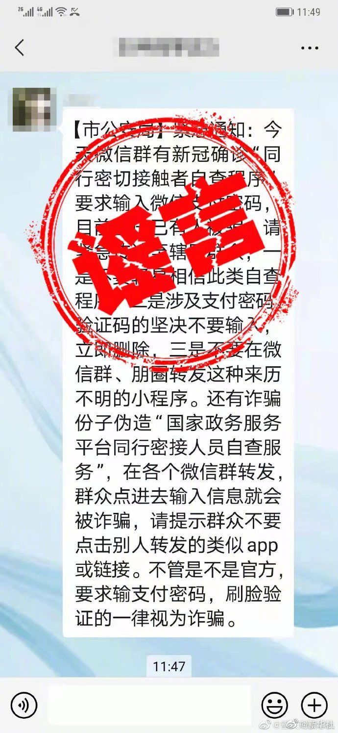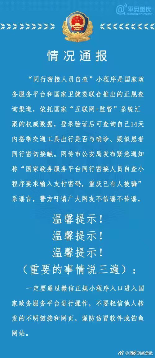 【重庆:同行密接人员自查小程序输入密码被骗系谣言】重庆市公安局刑事警察总队11月4日发布情况通报说,网传市公安局发布紧急通知称“国家政务服务平台同行密接人员自查小程序要求输入支付密码,重庆已有人被骗”系谣言。
