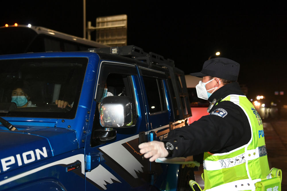 10月29日,民警引导滞留游客车辆通过额济纳旗收费站。新华社记者贝赫 摄