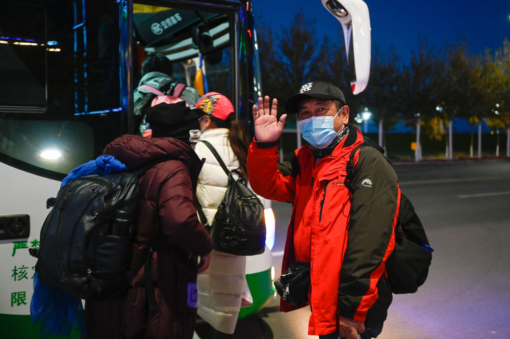 10月27日,滞留在额济纳旗的游客在登上大巴车前挥手道别。新华社记者贺书琛 摄