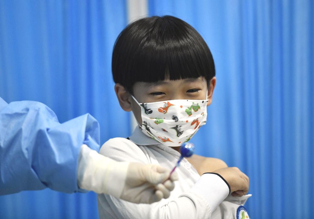 11月4日,德贤小学学生在完成疫苗接种后收到医务人员的棒棒糖。
