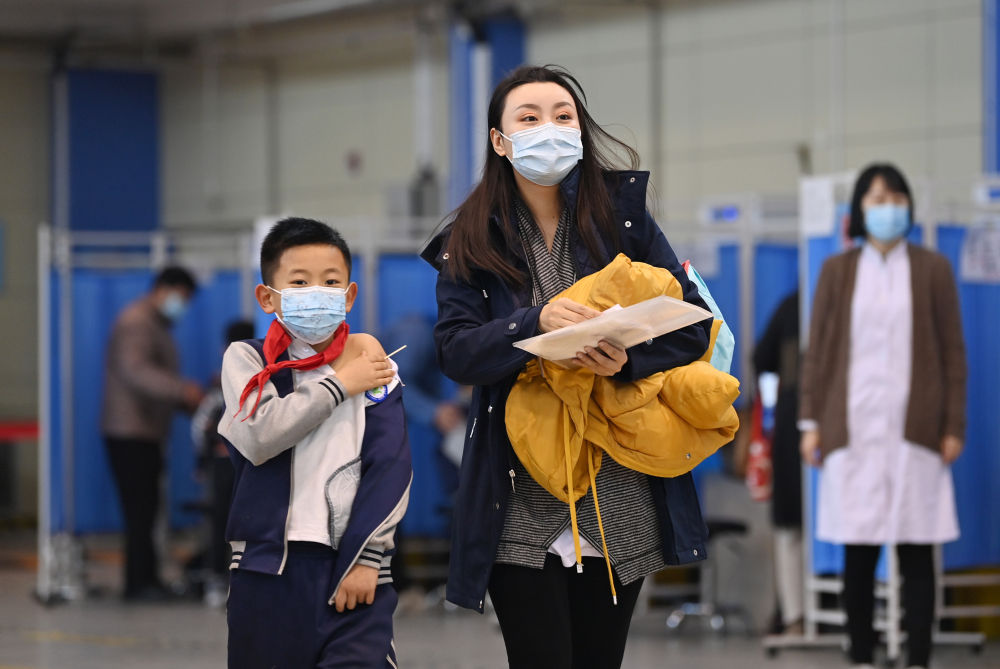 11月4日,德贤小学学生在家长陪伴下进行疫苗接种前的登记工作。