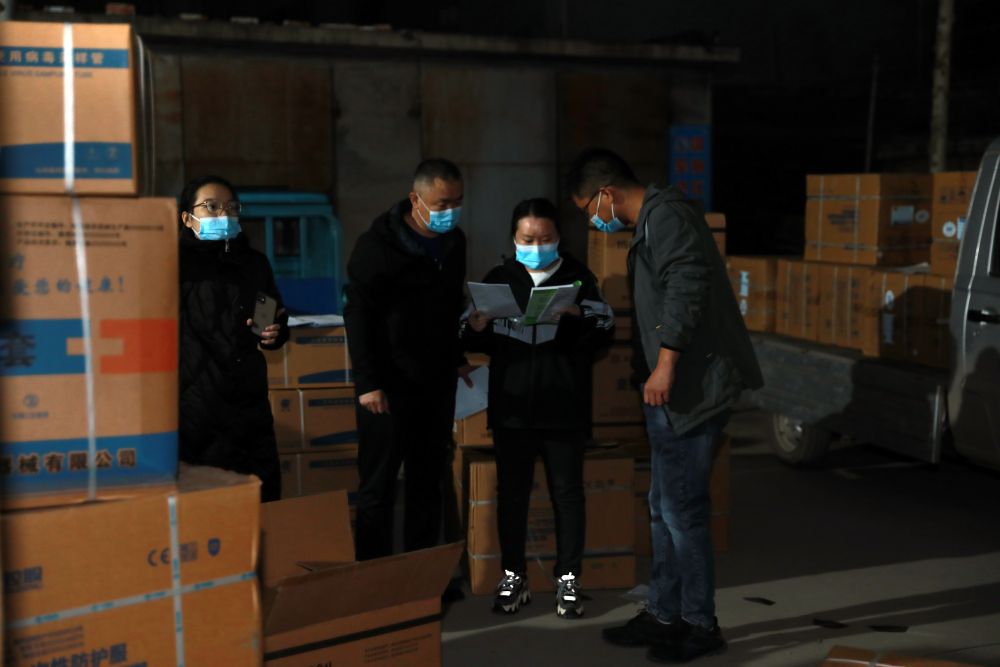 10月31日凌晨,在石家庄市深泽县卫健局院内,工作人员在清点防疫物资。(翟海静 摄)