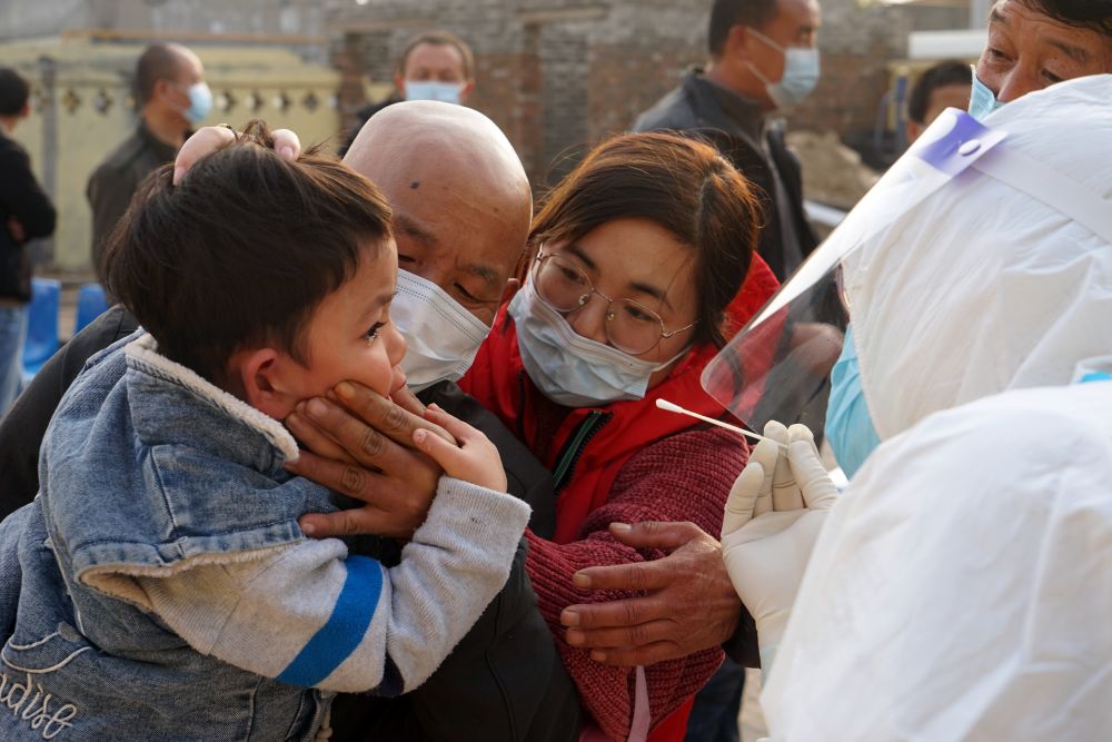 11月2日,医护人员为石家庄市深泽县东关村村民进行核酸检测。(翟海静 摄)