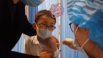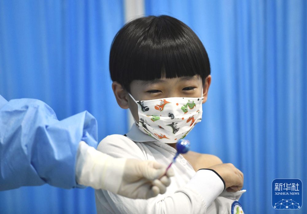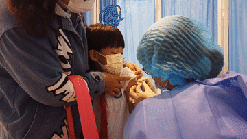 ↑德贤小学学生在完成疫苗接种后收到医务人员的棒棒糖。