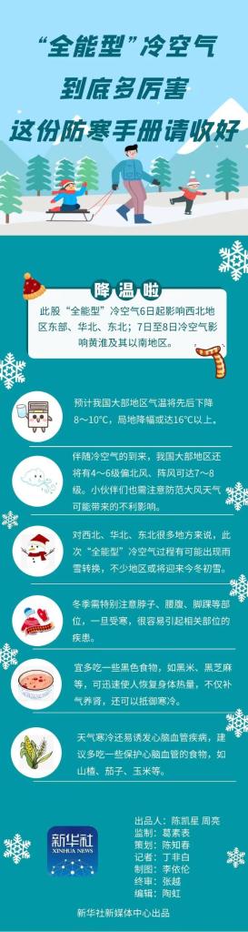 此股冷空气之所以被称为“全能型”,是因为此次天气过程具有影响范围广、降温剧烈、气温低、大风持续时间长等特点,并自西向东、自北向南陆续影响我国大部地区,预计我国大部地区气温将先后下降8—10摄氏度,局地降幅或达16摄氏度以上。