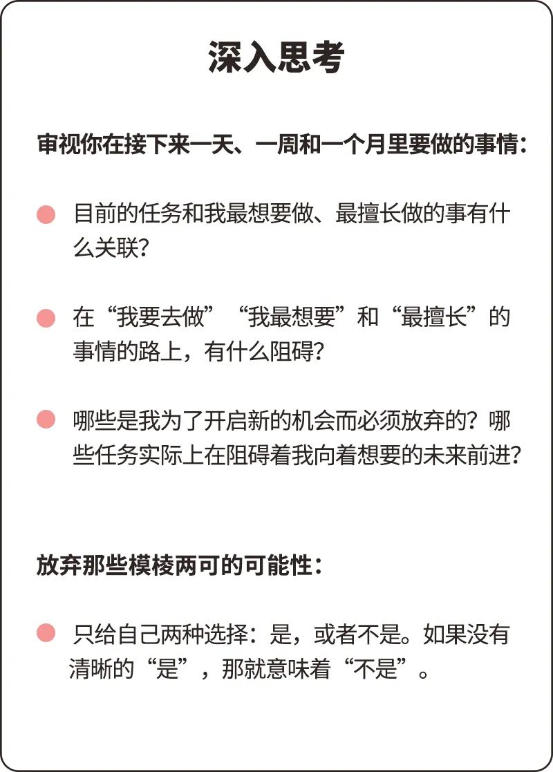 这种断舍离,不是对压力和工作偶尔说“不”,而是有目的地、深思熟虑地、战略性地淘汰对自己来说不重要的事情,也能够放弃一些很好的机会;不要疲于应付那些使你多线作战的社会压力,而是要聚焦于真正重要的事情,淘汰其余的一切。