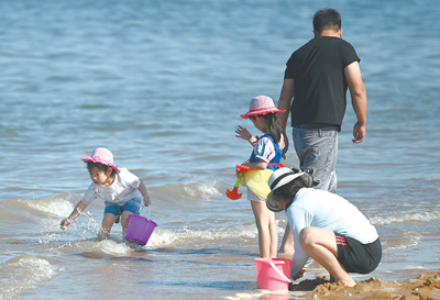 天津滨海新区东疆港人工沙滩上,儿童在家长陪伴下嬉戏。新华社记者 李 然摄