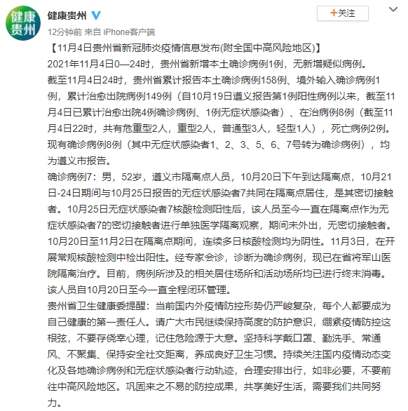 截至11月4日24时,贵州省累计报告本土确诊病例158例、境外输入确诊病例1例,累计治愈出院病例149例(自10月19日遵义报告第1例阳性病例以来,截至11月4日已累计治愈出院4例确诊病例、1例无症状感染者)、在治病例8例(截至11月4日22时,共有危重型2人,重型2人,普通型3人,轻型1人),死亡病例2例。现有确诊病例8例(其中无症状感染者1、2、3、5、6、7号转为确诊病例),均为遵义市报告。