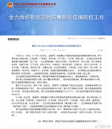 截至11月4日24时,据31个省(自治区、直辖市)和新疆生产建设兵团报告,现有确诊病例1129例(其中重症病例37例),累计治愈出院病例91840例,累计死亡病例4636例,累计报告确诊病例97605例,现有疑似病例4例。累计追踪到密切接触者1272333人,尚在医学观察的密切接触者45386人。