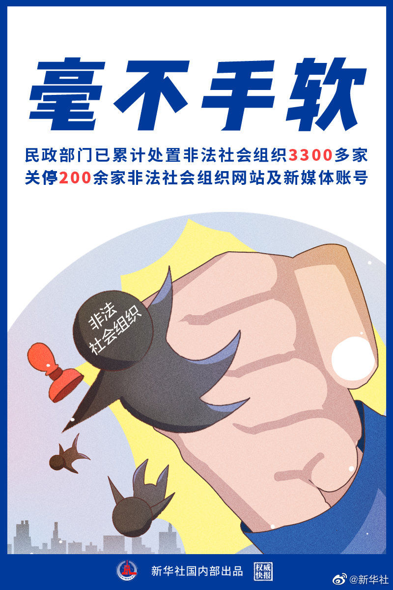 【权威快报丨毫不手软!民政部门已累计处置非法社会组织3300多家】记者5日从民政部举行的第四季度例行新闻发布会上获悉,民政部门始终对非法社会组织保持高压态势,部本级和地方民政部门已累计处置非法社会组织3300多家,关停200余家非法社会组织网站及新媒体账号。(记者高蕾,海报设计杨轶群)