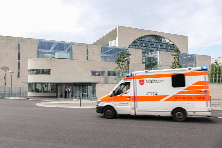 8月10日,在德国首都柏林,一辆救护车从德国总理府附近驶过。(新华社发,斯特凡·蔡茨摄)
