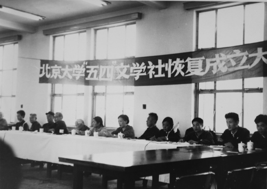9月23日上午在北大图书馆召开了北京大学五四文学社恢复成立大会。北大校党委副书记马石江、副校长季羡林,北大名教授朱光潜、王瑶,鲁迅挚友章廷谦(川岛),诗评家谢冕,诗人张志民,作家刘心武,《北京文艺》的负责人周雁如,《人民日报》记者丁宏新和叶幼琴,《中国青年报》记者狄沙和顾志成出席大会,出席的其他同志还有校团委和学生会负责人王丽梅、隋凤花、袁纯清、张幼华。会上展示了沈雁冰先生的复信和题签,博得热烈掌声。校领导宣布五四文学社领导班子成员:北大党委副书记韦明任名誉社长,朱光潜、曹靖华、季羡林、王瑶、章廷谦、谢冕、张文定等任顾问,张幼华任社长,陈建功、邹士方、李志红任副社长。马石江、季羡林发言,表示祝贺,之后来宾发言。会后与会者在图书馆前合影留念。