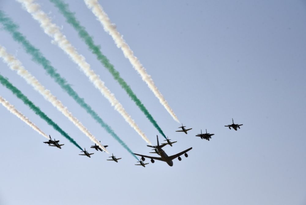 9月23日,沙特阿拉伯首都利雅得举行飞行表演庆祝国庆日。(新华社记者胡冠摄)