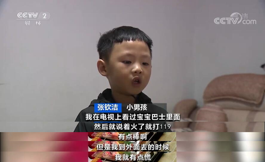 据介绍,当天小男孩张钦洁的父母外出送货,只有他一人在家。遇到电器突发火灾时,他虽然有点慌,但仍能镇定自若的将电源插座拔掉,打电话报警,向消防员叔叔讲清楚家庭住址和起火物,并且自己能采取措施灭火。因处置及时,火势没有蔓延。