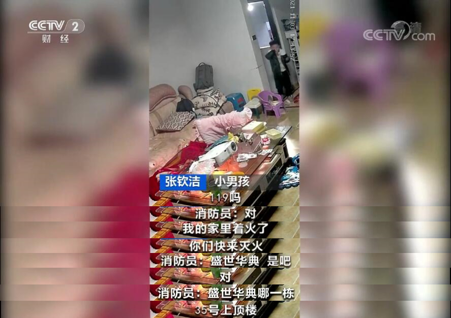 通过事发时的监控显示,17时39分左右,4岁小男孩张钦洁独自一人在家看书,这时茶几上的电器突然起火,(发出)一阵火光后升起一股浓烟。但他并未害怕,而是跑出去给妈妈打电话,告诉家里着火了。随即,他跑回家中将电源插座拔掉。由于没有大人在家,几分钟后小男孩又从厕所接来一小桶水朝着起火位置浇去,途中虽然摔了几跤,将水倒在了地上,但是他没有放弃,爬起来之后又去厨房接水继续灭火。