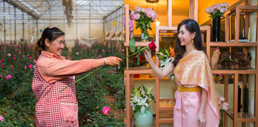 ↑2019年2月,泰国曼谷的一位女士(右)“接过”云南花农“递出”的一支鲜花(拼版照片)。