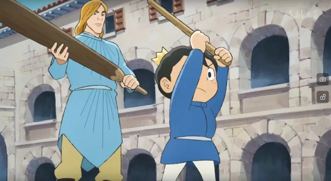 “剑圣”多玛斯被安排去训练波吉,好让他成为独当一面的剑士。但看着眼前瘦弱的王子挥舞细竹竿的样子,多玛斯也有种恨铁不成钢的感觉,只好拿身后的剑靶当泄愤工具。