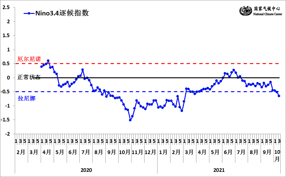 2020年3月~2021年10月,Nino3.4区的海温指数。